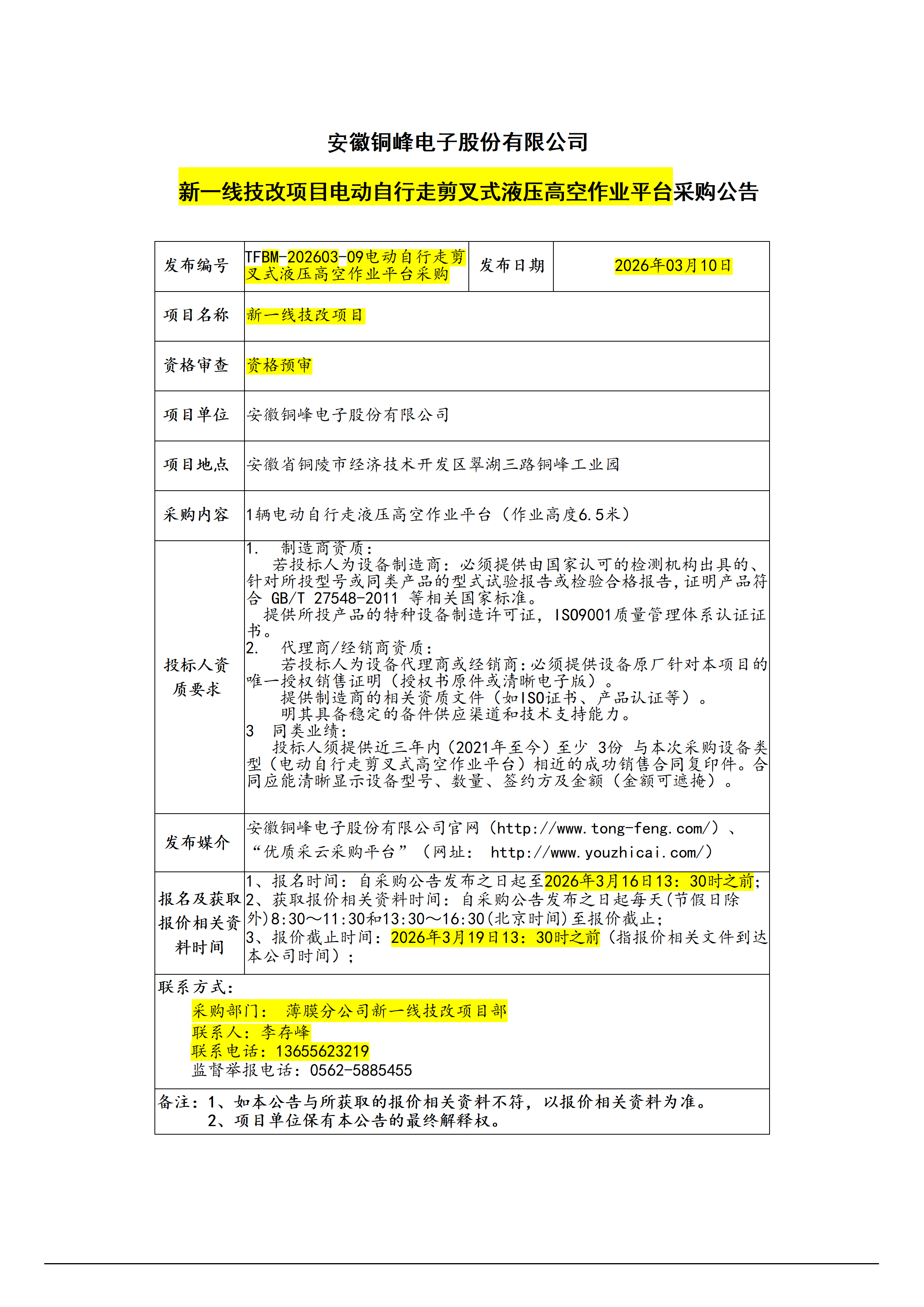 安徽銅峰電子股份有限公司 (新一線電動(dòng)登高車采購招標(biāo)公告)_01