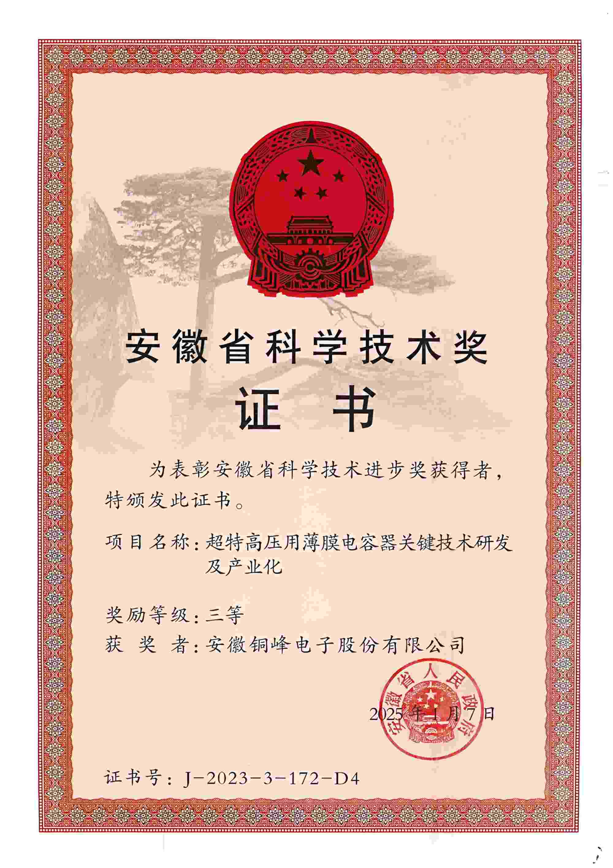 5月12日上午,安徽省科技創(chuàng)新大會(huì)召開(kāi),隆重表彰2023年度安徽省科學(xué)技術(shù)獎(jiǎng)勵(lì)獲獎(jiǎng)人員和組織。公司與國(guó)網(wǎng)安徽省電力有限公司、國(guó)網(wǎng)智能電網(wǎng)研究院有限公司、西安交通大學(xué)等單位聯(lián)合完成的“超特高壓用薄膜電容器關(guān)鍵技術(shù)研發(fā)及產(chǎn)業(yè)化項(xiàng)目”榮獲安徽省科技進(jìn)步三等獎(jiǎng)。